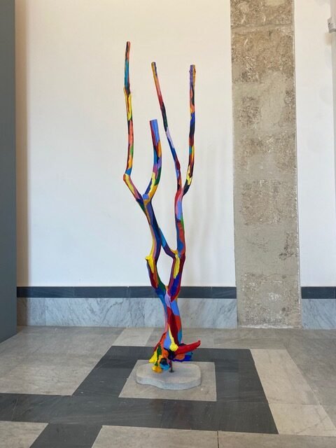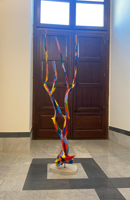 Son style se distingue par des couleurs vives, des motifs complexes et un usage profondément symbolique de la matière. Chaque œuvre naît d’une rencontre entre le geste artistique et un fragment de réalité : une branche tombée, une racine tordue, un souvenir culturel ou collectif. Ces éléments deviennent les supports d’une réflexion sur la société contemporaine, mais aussi les vecteurs d’un message d’espoir.